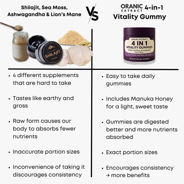 Our ORANIC EXTRACT® 4-in-1 Wellness Gummies packages all the benefits of Shilajit, Sea Moss, Ashwagandha, & Lion's Mane into a daily bite sized gummy. Take 1 per day and easily achieve all the benefits.